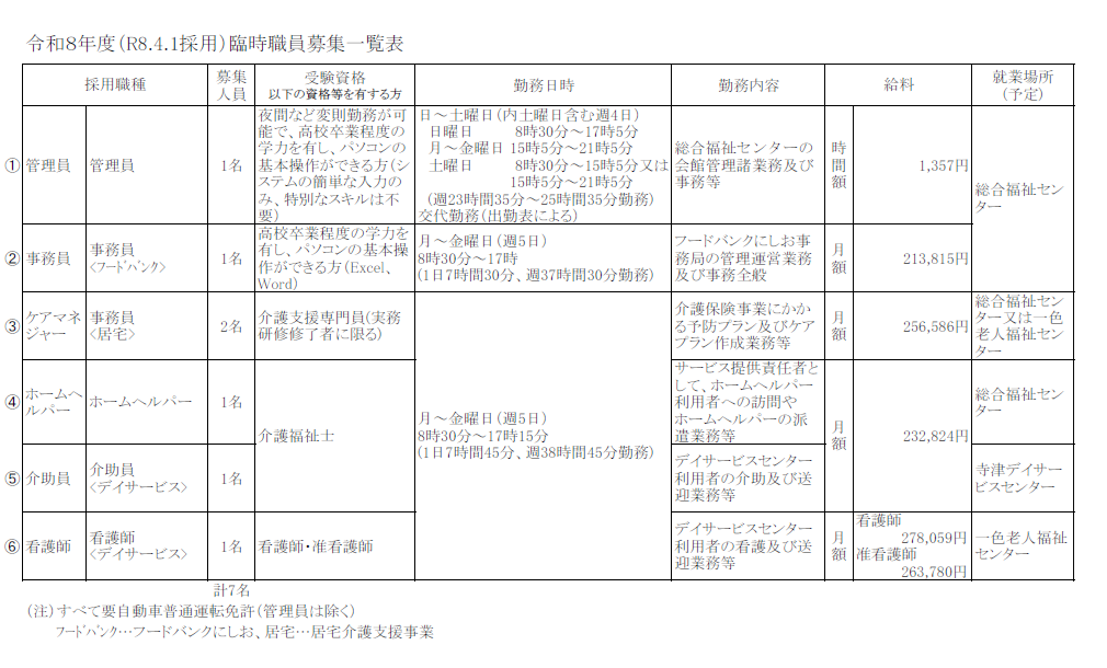 ※詳細は各職種の「社会福祉法人西尾市社会福祉協議会臨時職員採用選考要項」をご覧ください。